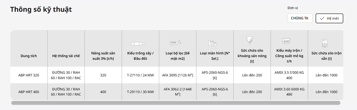 ₫"HRT" là viết tắt của "Công nghệ tái chế cao" và đó là điều làm nên sự khác biệt của nhà máy này, lý tưởng cho sản xuất nhựa đường với tỷ lệ RAP lớn. Một trống sấy RAP tích hợp bổ sung (dòng chảy song song RAH60 hoặc dòng chảy ngược RAH100 với máy phát khí nóng) được đặt ngay phía trên máy trộn.
